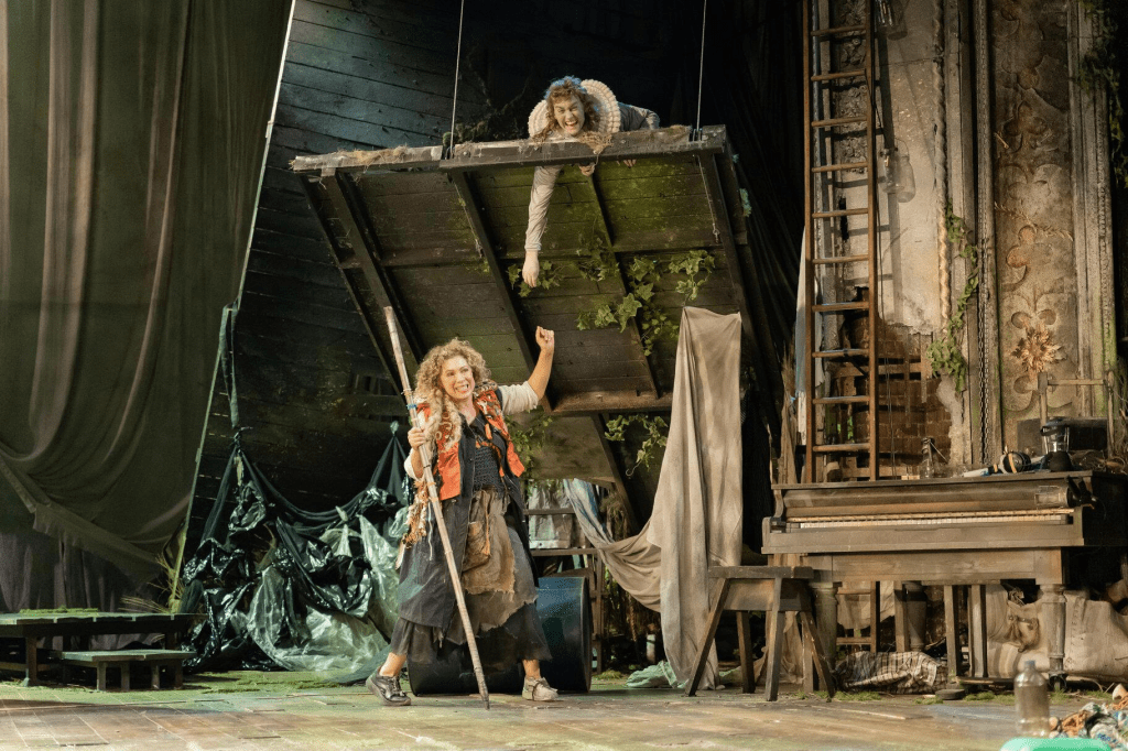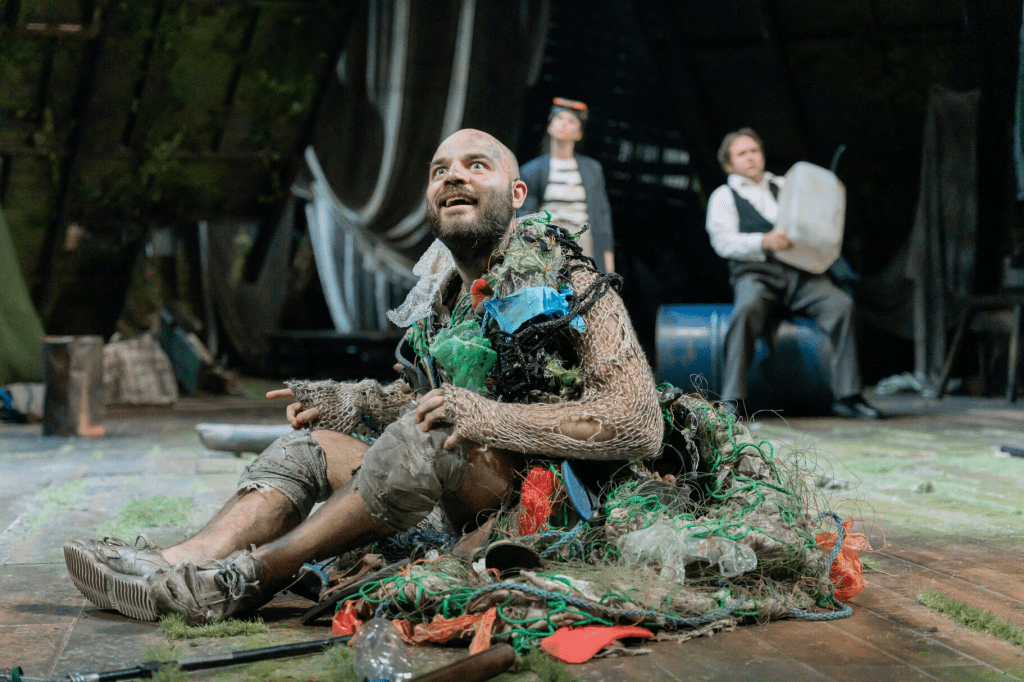 The design for the play is centred around the climate emergency (following the idea that Prospero’s manmade tempest mirrors manmade climate change in the present day), and the stage is littered with objects that look like they could have washed up on the beach. (The programme shows that some of the objects were collected on a litter pick on Weston-super-Mare beach.) Throughout the course of the play, each object is used in some respect, showing just how cleverly the play has been put together, ensuring that each object has a purpose and is placed in the correct spot for an actor to pick up at the right time.