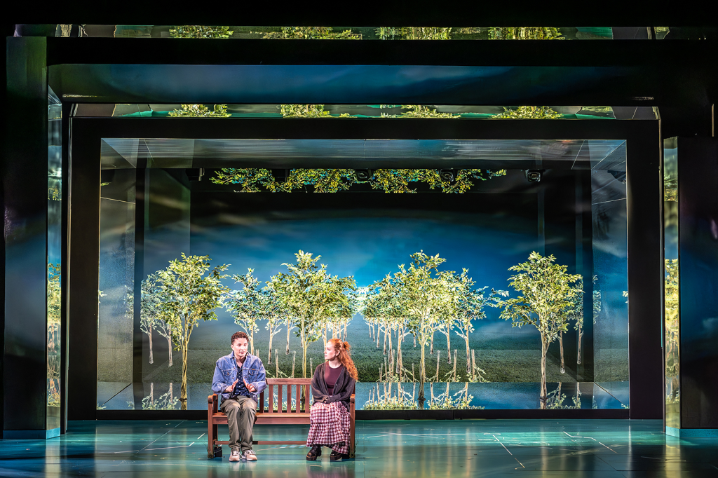 The set, designed by Morgan Large, is also revamped for this touring production, drawing heavily on reflections (the stage is surrounded by large mirrors) and frosted glass windows, reminiscent of the secrets and lies that Evan surrounds himself with. Numerous screens show video design from Ravi Deepres, which help to elevate some moments from songs – the stage is flooded with light during “For Forever” as Evan describes climbing a tree and basking in the sunlight. Some may argue that this additional video design draws attention away from the actors, yet I felt it elevated their performances to further heights. The inclusion of BSL interpreters on the screens during “You Will Be Found” also helped to highlight the ideas that permeate throughout the show – that “everyone matters”.