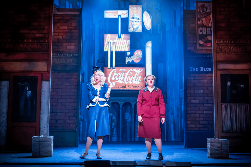 The play begins with a full-throttle performance of opening number “Runyonland” (named after writer Damon Runyon, on whose stories the musical is based), with the 30+ strong ensemble embodying various characters, from cheerleaders to high school jocks to petty criminals. This immediately sets the scene for what is to come, which is often a tongue-in-cheek look at Prohibition-era American gangsters, with all your usual stereotypes thrown in for good measure. The set design from Lowestoft’s Scenic Projects harks back to the golden era of Broadway musicals, with gorgeous backdrops helping to bring the static world of New York to the stage.