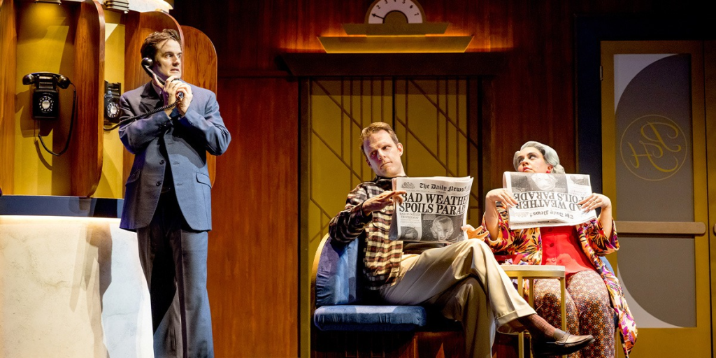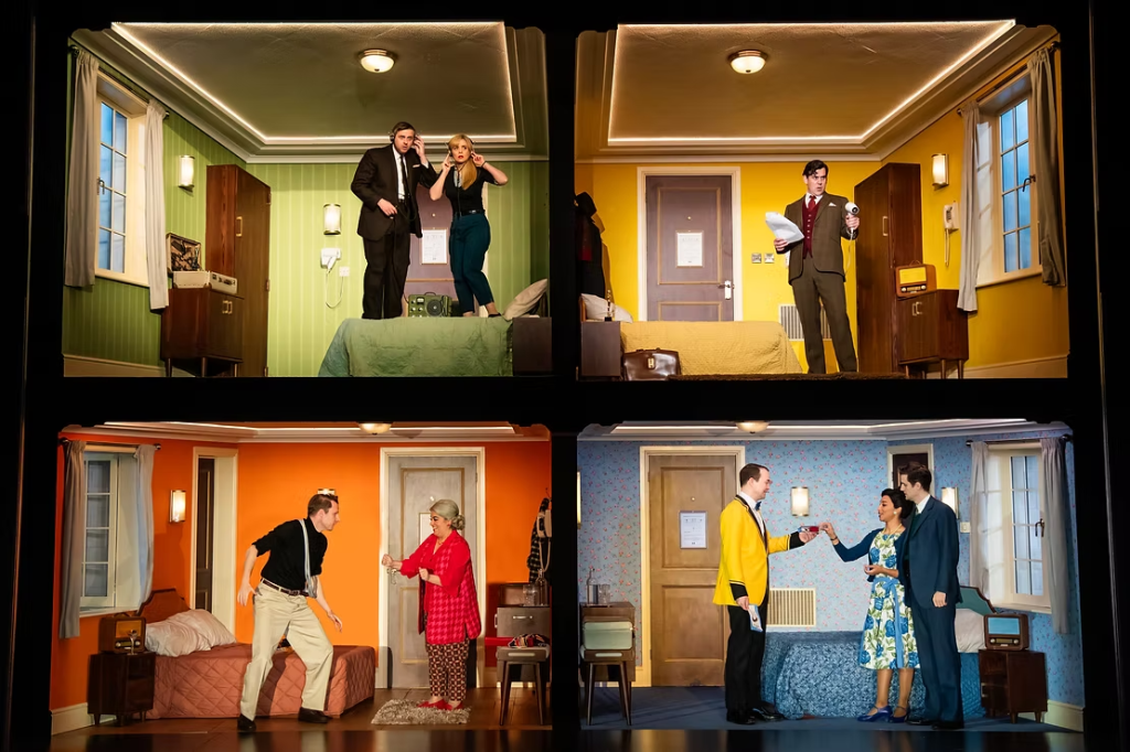 David Farley’s set design is ingenious, helping to bring to life several different action sequences, including a vertical race through a lift shaft and a showdown on the hotel rooftop. A memorable scene in the opening act sees four rooms stacked on top of each other like a Rubik’s cube, allowing the audience to be privy to goings on in the American, Russian and British rooms, whilst Woodbead rehearses for his audition in the final room. Each room is cleverly colour coordinated so that when bugged radios begin to get swapped between them, the audience can easily keep track of where each one ends up. One slight problem with this set-up is that it causes a few sightline issues for those on the upper tiers – the theatre provides TV monitors to counteract this, but it may slightly dampen the audience’s enjoyment.