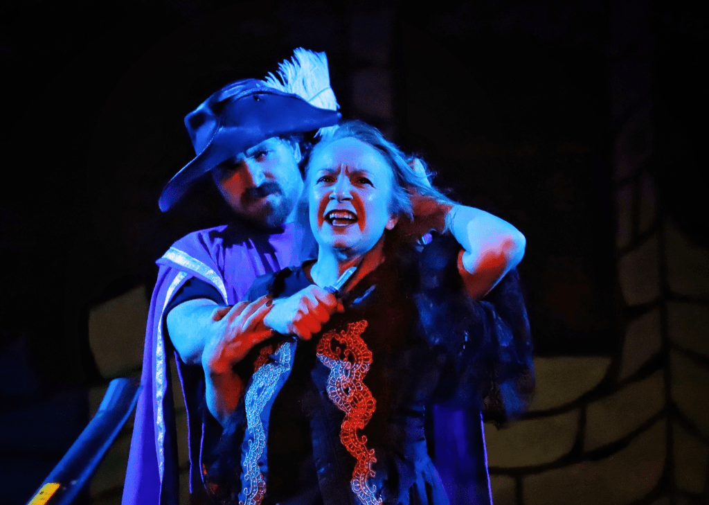 As cake-loving Porthos, Tilda Stickley rides around on a tricycle, hardly striking fear into the crowd but providing plenty of laughs. Stickley truly shines as the conniving Milady de Winter, using her Alpine lake eyes to seduce every man she comes across, which leads to some off-stage action with some – ahem – interesting sound effects. A confrontation between the Musketeers and Milady sees the actors blasted by a vacuum cleaner and dead leaves in a very funny climactic moment.