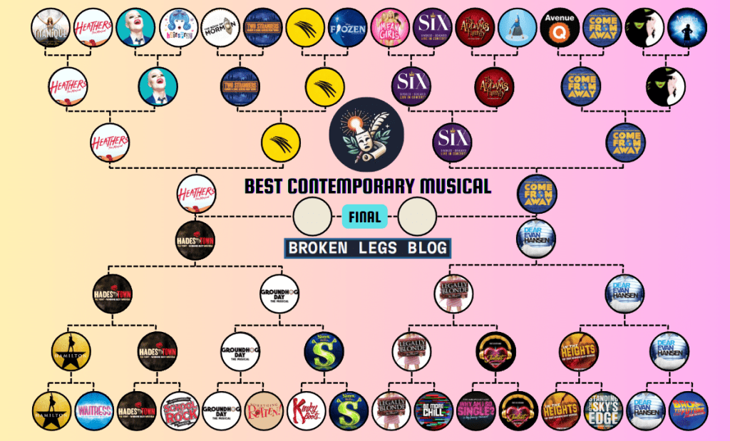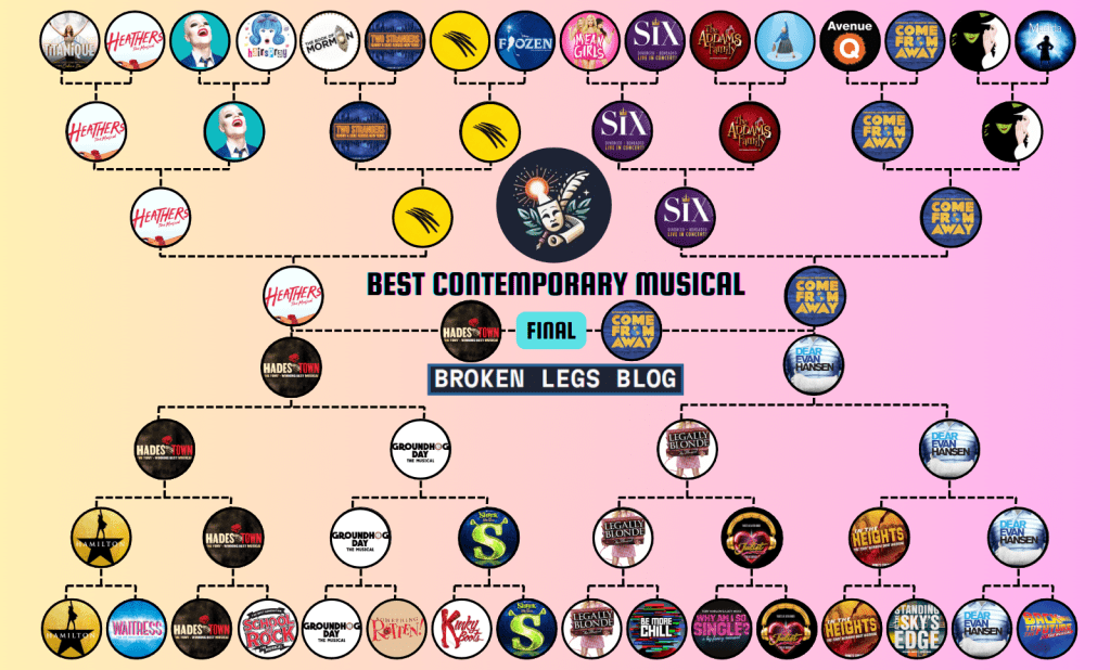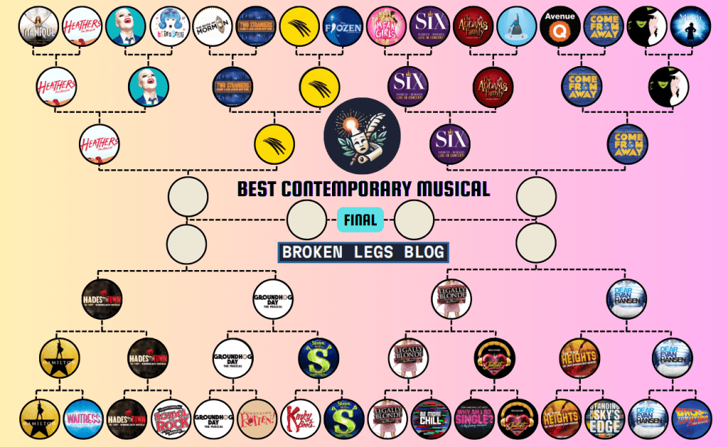 Over the past few weeks, followers of the Broken Legs Blog Instagram page have been voting for their favourite contemporary musical (defined as those first staged after the year 2000). In the opening round, a shortlist of 32 different musicals were randomly paired up to face-off against each other for a place in the final 16. These featured some well-known West End stalwarts, such as “Wicked”, “Hamilton” and “The Book of Mormon”, alongside lesser-known musicals that have premiered more recently, such as “Titanique” and “Two Strangers (carry a cake across New York)”.