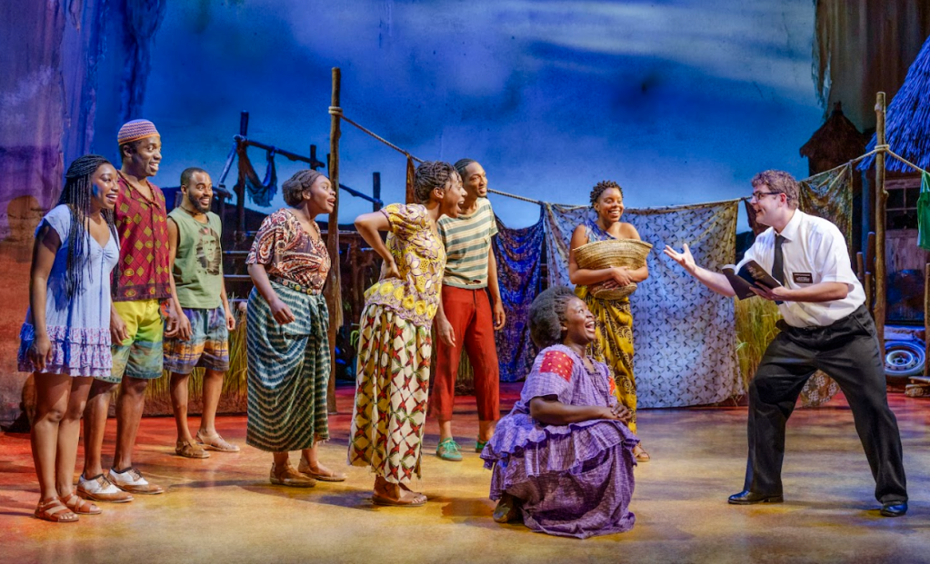 The set design (Scott Pask) brings to life a variety of different settings, but the choice to have the set raised about half a metre above the Theatre Royal stage is an odd one, which results in some masking for those sat in the stalls (as the characters arrive in Uganda, they see an old man dragging a dead donkey across the stage, but this curious staging choice meant that the prop was mostly obscured from our view in the stalls by the lip of the stage). There were also a few lighting mishaps (the end of the show saw a slightly misplaced spotlight on Price, Cunningham and Nabulungi), but this is the opening night in the Nottingham venue, and will surely be rectified for future performances. Little seems to have changed about this production since its previous tour, although Cunningham’s choreography seems to lean into TikTok and Fortnite-inspired dances a little more, whilst an unexpected reference to Nigel Farage makes for an incredibly funny joke, even if it feels a little misplaced.