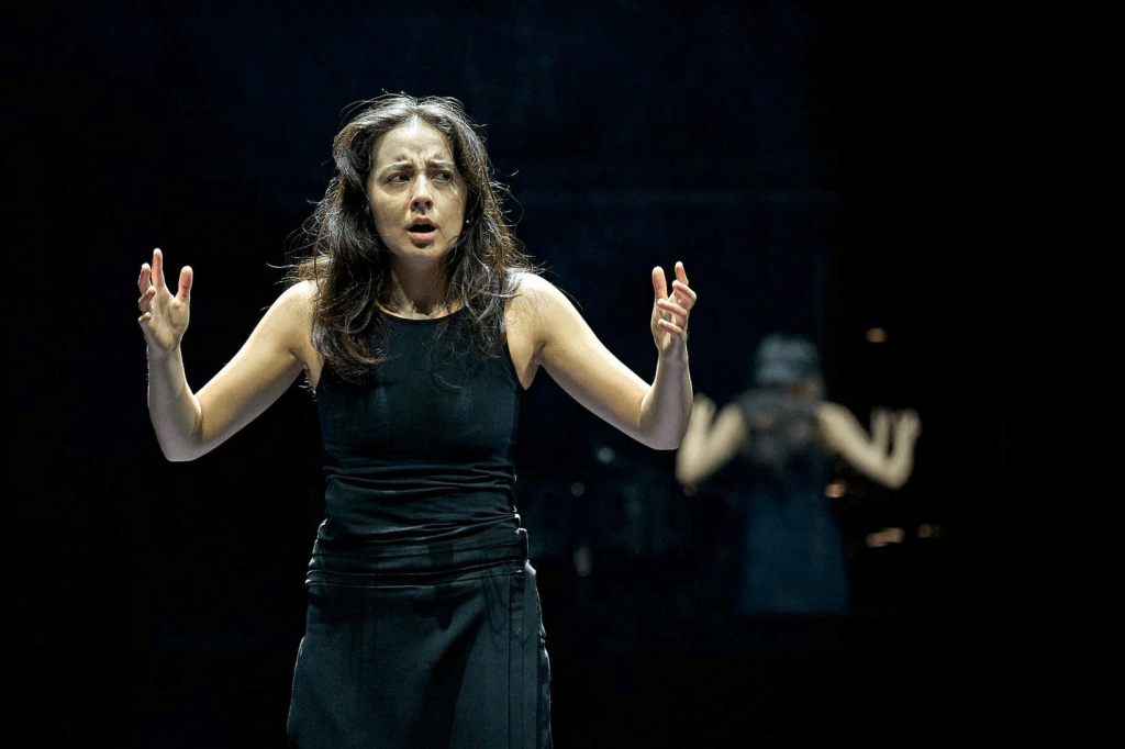 Samuel Blenkin’s Hamlet is filled with grief – our introduction to the character finds him lying on the floor, disconnected from the world and full of self pity. He gabbles his speeches so quickly they almost run away from him, as his questions and thoughts pull him in all directions. This is an exhausting performance, elevated more so by Radiohead’s music, which Blenkin uses to carry him through the journey, allowing his movements and emotions to match the rhythm of the anthems. Yorke has chosen his tracks with utmost care to mirror the story – the track listing doesn’t follow the order from the original album; instead it has been shaped and altered to ensure that it never feels out of place within the world of Elsinore.
