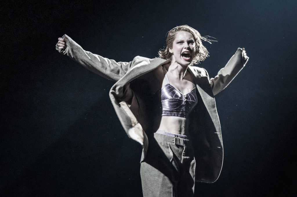 The main show is introduced with a sudden drum-roll, as Rob Madge’s Emcee is revealed, in garish make-up and party hat, to kick off proceedings. Madge is superb in the role, launching between cheeky asides and more sincere moments. He takes the lead in many of the numbers scattered throughout the show, functioning as tongue-in-cheek Cabaret performances but with deeper meanings that mimic the ongoing story elsewhere – Two Ladies, a song about a threesome which features dancers doing unmentionable things with a whisk and a baguette, is actually about hidden desires and bisexuality, whilst Madge’s make-up becomes more Harlequin-esque for the song Money, both a dig at Jewish stereotypes and a commentary on the powers of the rich. At times, Madge’s voice strays a little too far into his higher range, making some of his lyrics difficult to catch, but on the whole he is mesmerising throughout. His sudden change in the latter half of the play to become a blonde-haired, steadfast, Nazi-sympathising citizen appears so out of character that he is initially unrecognisable, lending to the musical’s downbeat ending and proving to be a true testament to Madge’s skill.