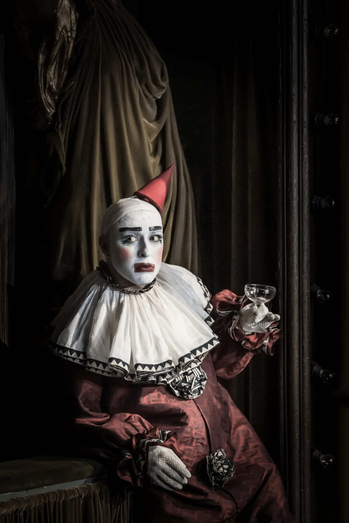 Upon arrival at the Kit Kat Klub (the former Playhouse Theatre, renamed in honour of Cabaret which has played there since 2021), you will find the front doors locked, and the windows blacked out. In order to access the theatre, you must enter through a secret side entrance, and taken down into the bowels of the theatre, where you are given a free shot of peach schnapps and stickers are applied to your phone camera to prevent any photos from being taken inside. Actors and musicians freely walk around the three different bar areas – audience members are warned to look but not touch, as scantily-clad performers weave their way between them.