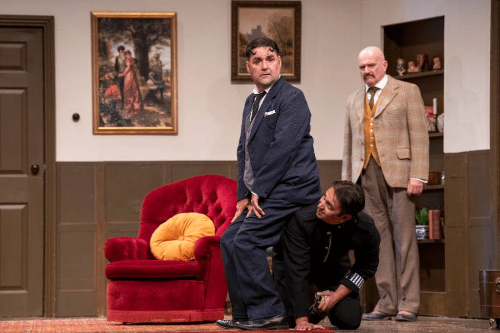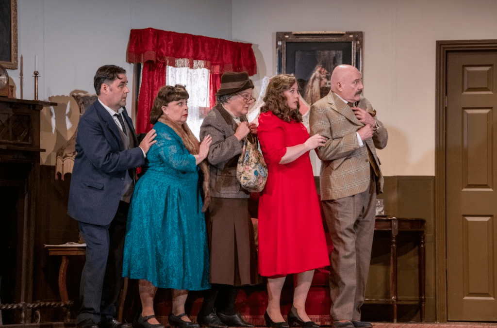 The story is mostly standalone, although Pavan Maru and Karen Henson reprise their roles as Constable Thomkins and busybody Miss Maple, and there are a few jokes made that reference last year’s tale, but rest assured that if you missed last year’s story, you should still be able to follow the plot. The play suffers from introducing too many characters and plot points a little too quickly – the first scene is a bit of a whirlwind of information, but once the story hits its stride, everything becomes clearer. Following the death of her father, Nancy Allwright (Sarah Wynne Kordas) is now the owner of Bagshot House, and she wastes no time in explaining the situation to the newly arrived Pratt, who misunderstands and misinterprets everything she says in his usual way. Pearce gives an excellent performance as Pratt, with several asides muttered under his breath which are sure to keep the audience laughing, and a healthy dose of physical comedy thrown in for good measure. He stumbles around the stage wreaking havoc, confusing the plot with various mispronounced words that add to the hilarity. Maru’s quietly intelligent policeman is a perfect foil for Pearce’s Pratt, smartly pointing out potential clues, and being the driving force that actually helps to solve the mystery, even though Pratt takes the credit.
