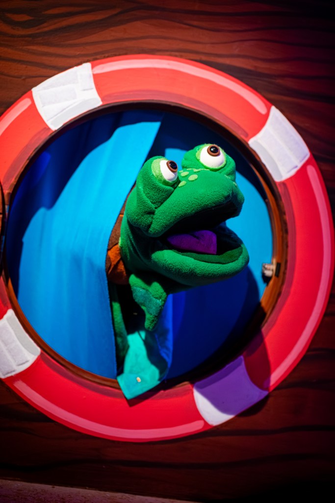 Most of the jokes come courtesy of Marina’s friend Sully, a turtle puppeted by West, who is most definitely a fan favourite, popping out from various parts of the set much to the audience’s delight. In fact, Emma Howson’s set is one of the most delightful aspects of this play, simplistic yet with incredible detail, various bits lifting up and folding out to reveal new details as the story progresses. It lends a cartoonish quality to the play, which fits the bill perfectly. The backdrop also features an integrated TV screen with video graphics courtesy of Sam Osborne. This video sometimes provides captions to accompany the scenes, although it is difficult to understand the purpose of this – if it is for accessibility purposes, it feels fairly substandard as not every line is captioned, and the plot would be difficult to follow for anyone that is hearing impaired and relying solely on these captions (it should be noted that there are some BSL performances available later on in the run). (EDIT: Since writing this review, I have been made aware that these captions are intended for children with auditory processing issues to help them understand the story. Separate, fully captioned performances are available for hearing impaired audience members. Thank you to the Nottingham Playhouse for reaching out and explaining this to me!)