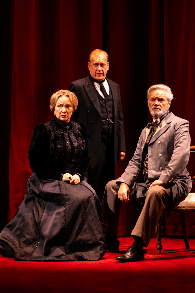 A story such as this warrants a large cast of characters, and director Josh Roche employs use of multi-role, although this can cause confusion at times, particularly in the case of Michael Lumsden, who portrays Swithin Forsyte and Jolyon Forsyte without even changing costumes. Both brothers are very similar characters, and as such Lumsden struggles to make them distinct – audience members could be forgiven for thinking they were two different characters. In act two, which moves the action on several years, Swithin is swiftly killed off (in a throwaway line about him having “passed away last year”), which calls into question whether it was even necessary to include the character in the first place. Emma Amos as both Emily Forsyte and Juley Forsyte struggles less in this department, but this is due to the stark differences between both characters, Emily portrayed as Soames’ distant, cold mother and Juley as a gossipy old aunt.