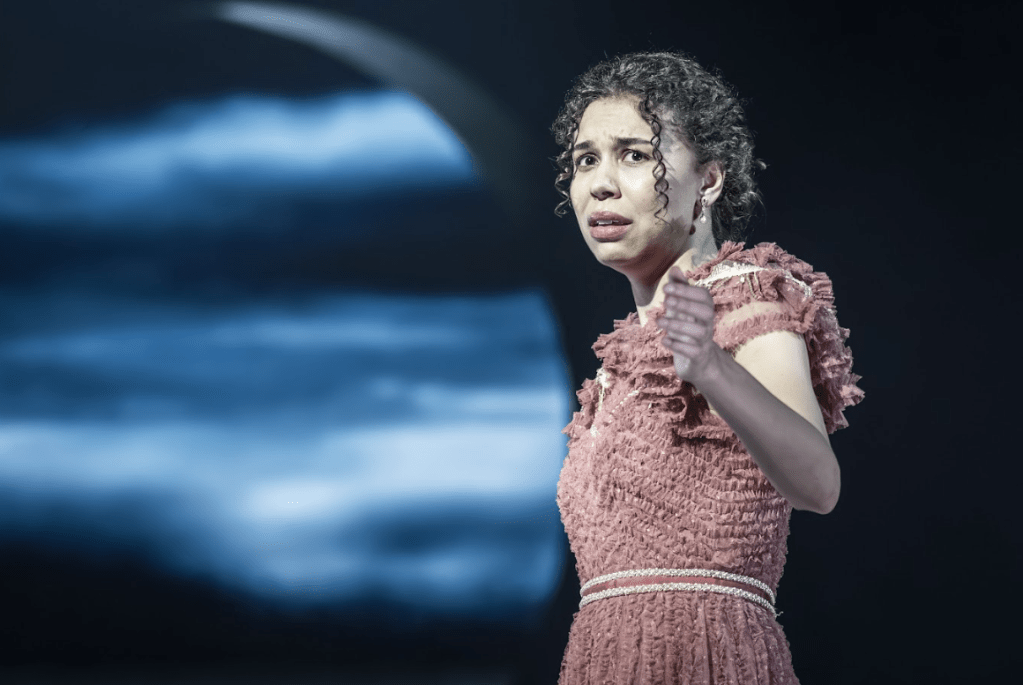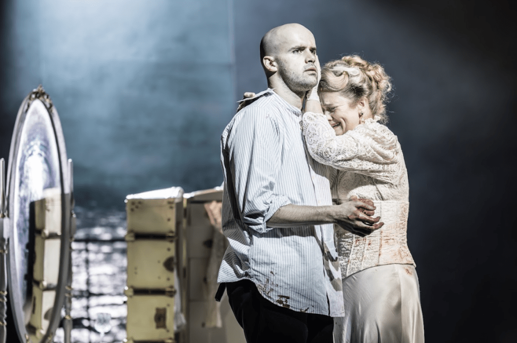 Es Devlin’s set design sees the actors on one of the steepest rakes I have ever seen, and those in the stalls may have a stiff neck by the final curtain. Hannes Langolf’s movement direction allows the cast to recreate the listing of the ship without the need for moveable scenery, and the final scene sees parts of the decking ripped away, leaving a hole for cast members to drop through as they meet their demise. It is a clever way of attempting to recreate the final scene as played in Stratford, but it is by no means perfect. Evie Gurney’s costume design remains excellent however, period accurate costumes helping to add a touch of class to proceedings.