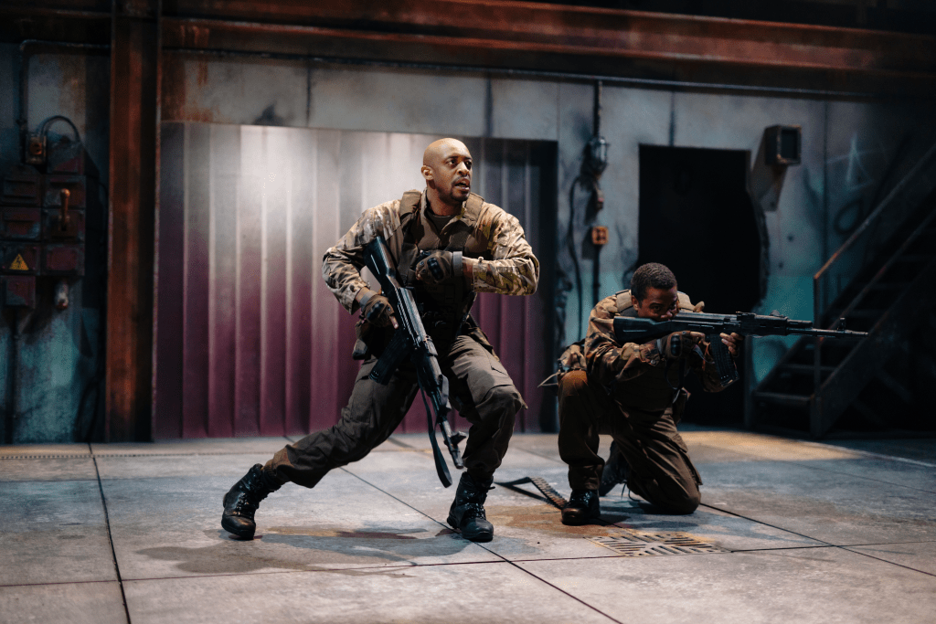 Set amidst a dystopian futuristic warzone, Derby Theatre’s “Macbeth” takes the original Shakespearean play and gives it a fresh, modern update. This action-packed production sees men in combat gear and army fatigues racing around the stage, rifles across their shoulders, as Macbeth seeks to achieve his ambition to become King. Yet beneath the violence and the hyper-masculinity lies a much more tender story – under the direction of Mark Babych, there is a clear focus on children and innocence, and it is in these quieter moments that the production soars, exploring themes that are often overlooked in favour of brutality and witchcraft.