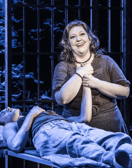 Molina shares a cell with political prisoner Valentin (George Blagden), although the nature of Valentin’s political activity is never properly explored beyond his obsession with Marxist ideology. Their relationship begins off particularly vitriolic – Valentin draws a line across the cell and insists that Molina doesn’t cross it – and yet, as the musical continues, they grow closer, Molina sharing the plots of Aurora’s films with Valentin that helps to calm him when the guards begin their interrogations. It is a relationship that builds slowly, in a way that feels genuine and believable. It means that, when the relationship takes on romantic undertones, it doesn’t feel forced or shoe-horned in any way – the characters have reached a point where the audience are willing this to happen, regardless of the consequences. This culminates in Molina stepping across to Valentin’s side of the cell, asking the double-entendre “have I crossed a line?” The audience hold their breath as they await Valentin’s answer.