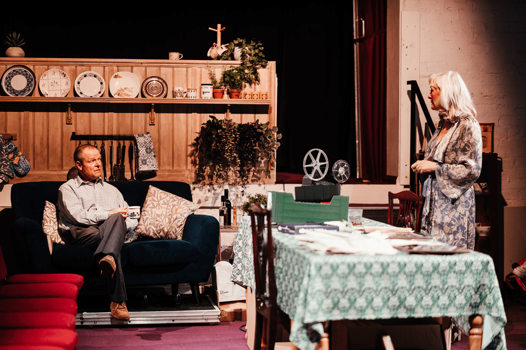 Angus Macrae’s set design makes excellent use of the Lace Market’s studio theatre, with the dining table set out amongst the audience, and the kitchen on the raised stage, allowing for some interesting dynamics as Robin stands above his wife, talking down to her both literally and figuratively. Throughout, the characters are always busy, making the show visually interesting and helping to hold the audience’s attention. Rather than just sitting and talking, Robin potters around making coffee and cocktails, whilst Diana spends some time setting up an old projector – a fascinating piece of kit sourced by Lesley Brown on props. It all feels incredibly natural and helps to put the audience at ease. Without these naturalistic flourishes, the play could be at risk of feeling like watching a parliamentary debate itself – instead, the entire conversation is given a domestic touch which is much more appealing.